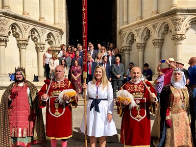 El Pendón de Alfonso VIII ya está en el Ayuntamiento de Cuenca, toda vez que se ha trasladado esta tarde desde la Catedral, tras el acto previo allí celebrado, de manos de la concejal más joven de la Corporación municipal, Nerea Sancho Beamud, que lo ha recibido bajo la promesa de devolverlo mañana, festividad de San Mateo.